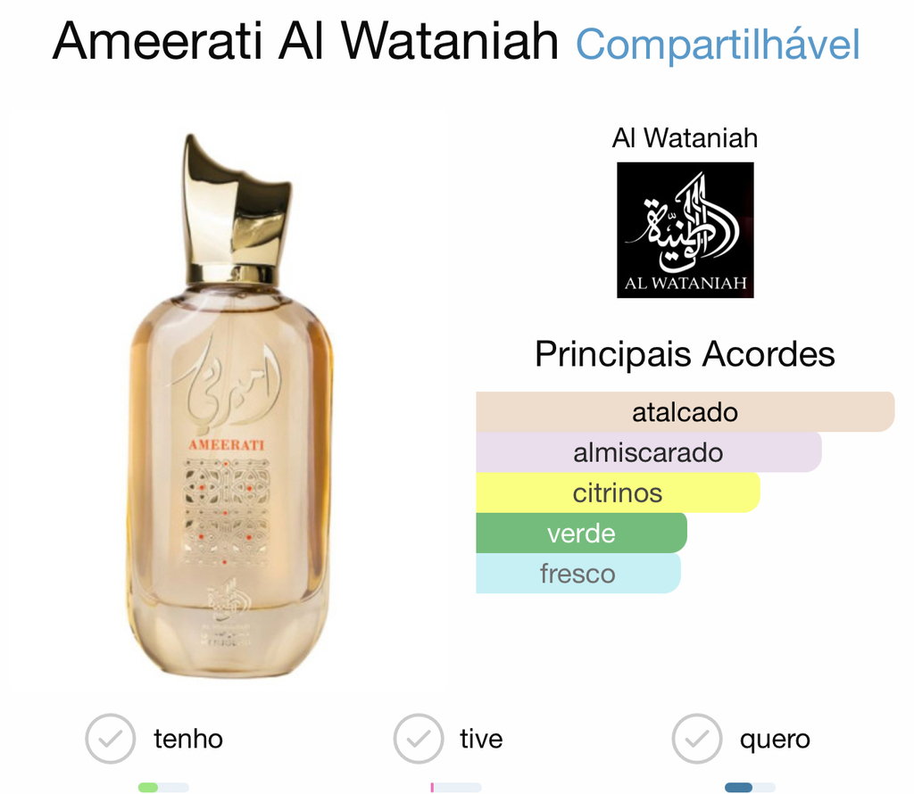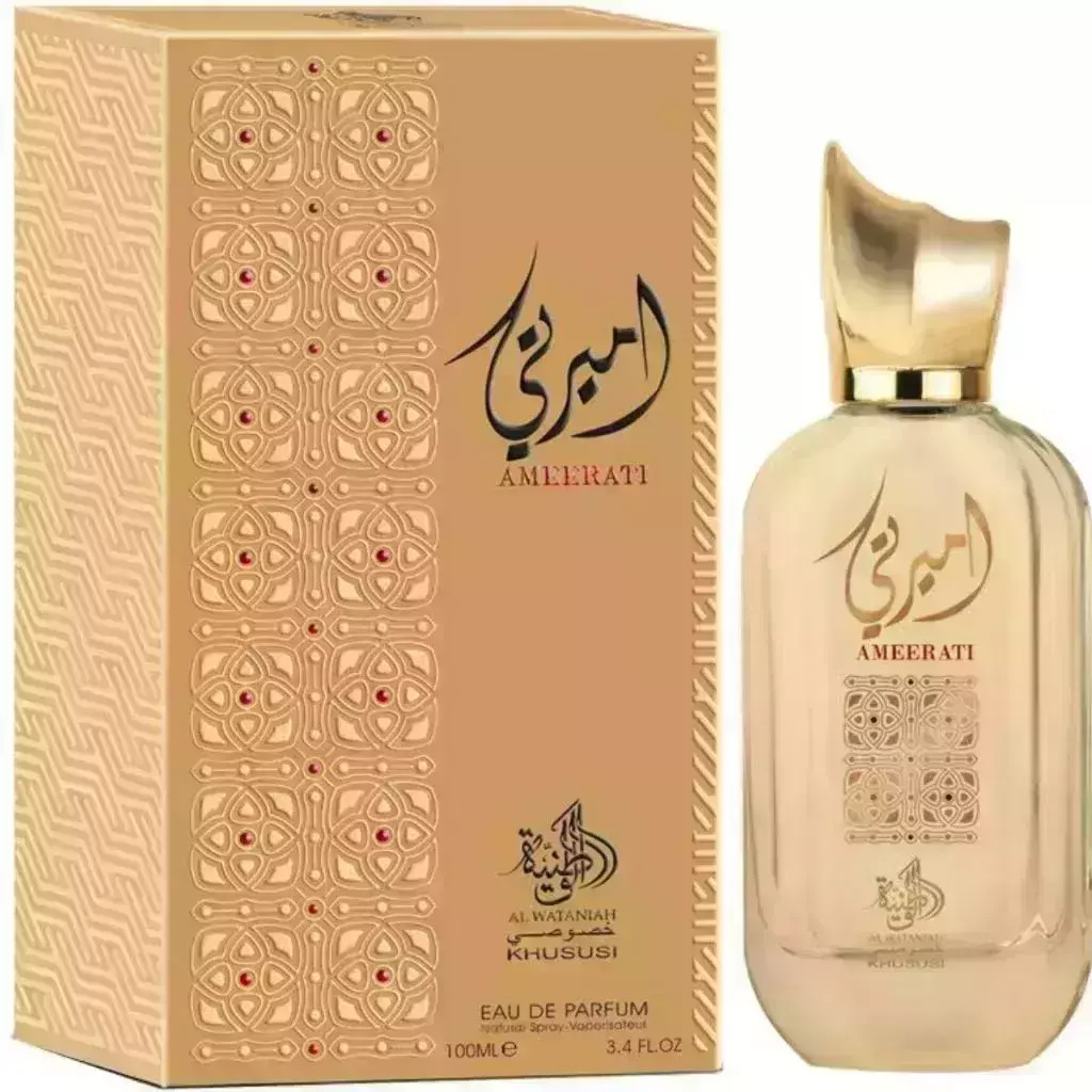 Ameerati de Al Wataniah é um perfume Aromático Especiado Compartilhável. Ameerati foi lançada em 2019. As notas de topo são: Almíscar, Cítricos e Notas Verdes. As notas de coração são: Notas Herbais e Notas Amadeiradas. As notas de fundo são: Notas Atalcadas e Notas Especiadas.