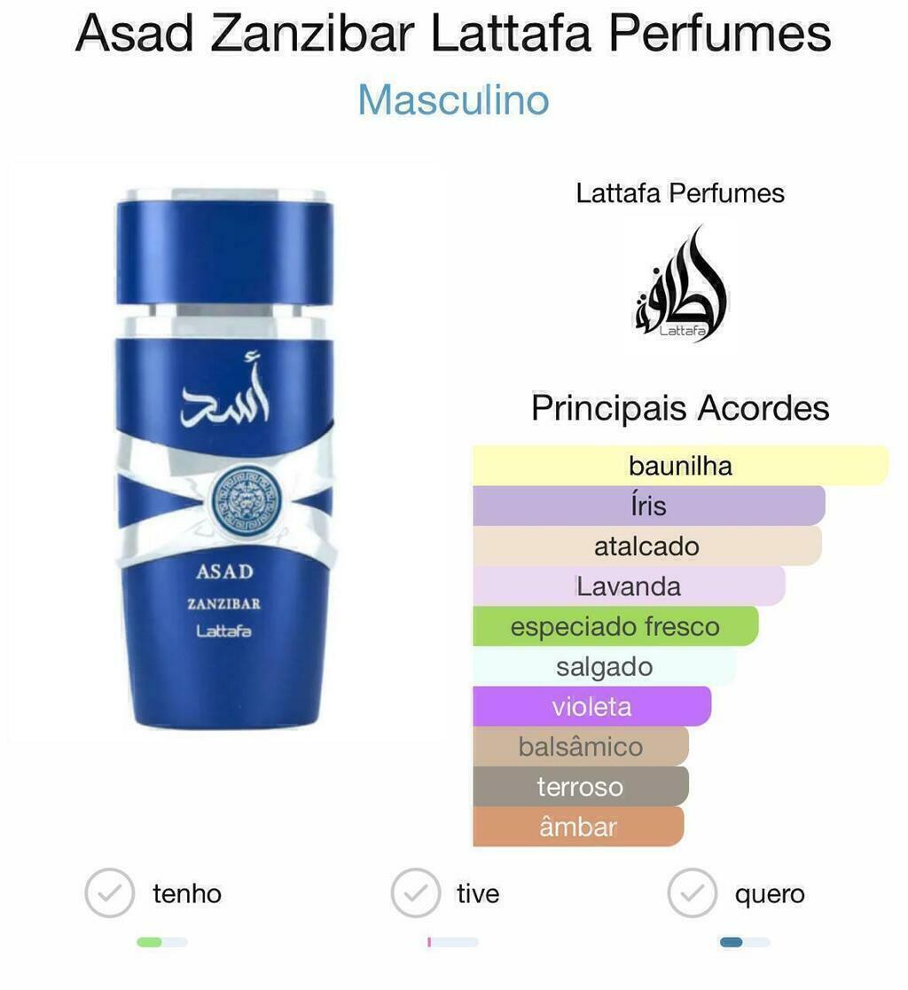 Asad Zanzibar de Lattafa Perfumes é um perfume Masculino. Esta é uma nova fragrância. Asad Zanzibar foi lançada em 2024. O perfumista que assina esta fragrância é Fanny Bal. As notas de topo são: Lavanda e Pimenta Preta. As notas de coração são: Água de Coco, Íris e Sal. As notas de fundo são: Baunilha e Incenso.