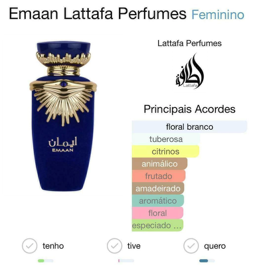 Emaan de Lattafa Perfumes é um perfume Chipre Floral Feminino. Esta é uma nova fragrância. Emaan foi lançada em 2022. As notas de topo são: Flor de Laranjeira, Bergamota e Groselha Preta. As notas de coração são: Tuberosa, Jasmim e Cravo-de-Defunto. As notas de fundo são: Baunilha, Almíscar, Patchouli e Cedro.