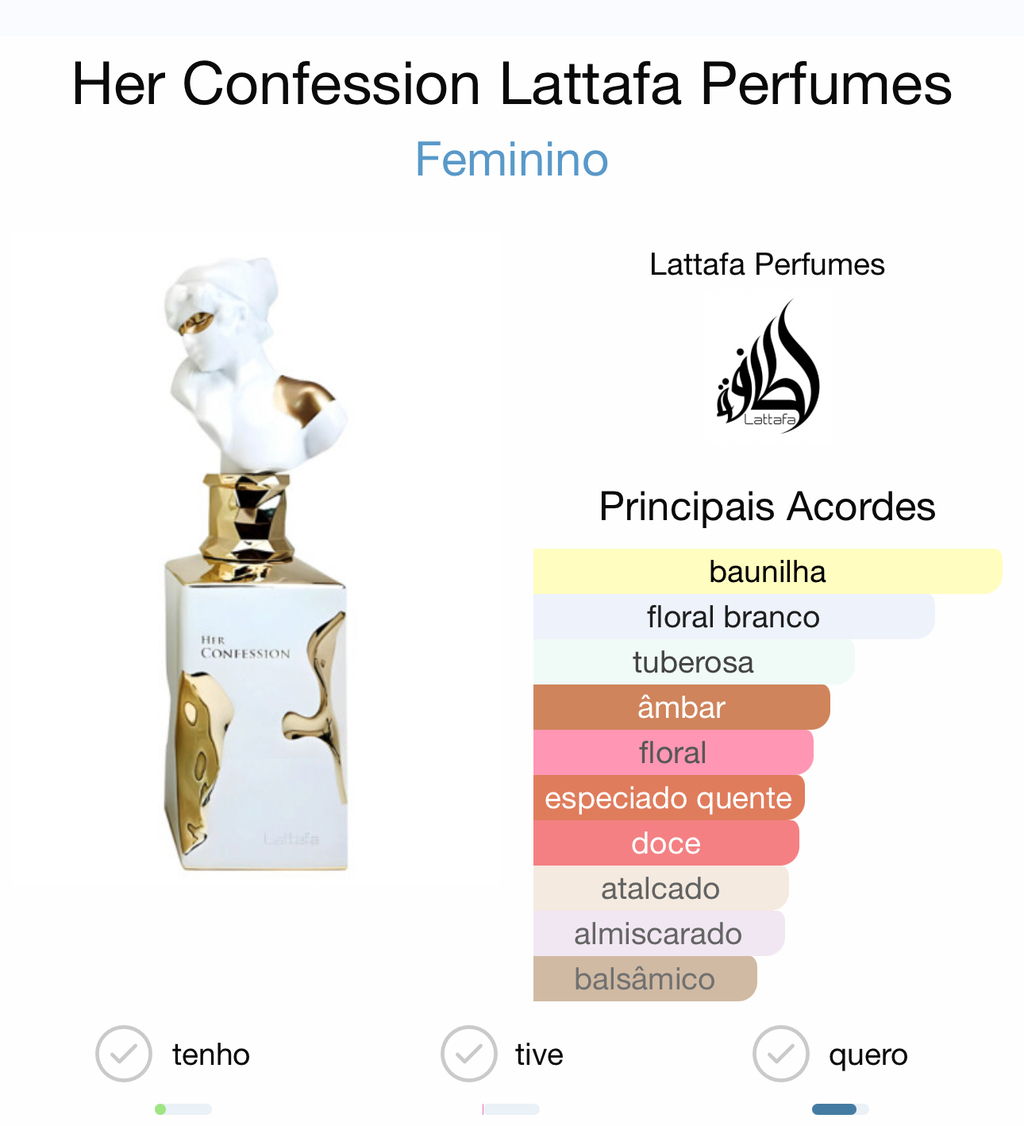 Her Confession de Lattafa Perfumes é um perfume Feminino. Esta é uma nova fragrância. Her Confession foi lançada em 2024. As notas de topo são: Canela e Mystikal. As notas de coração são: Tuberosa, Mahonial®, Jasmim e Incenso. As notas de fundo são: Baunilha, Fava Tonka e Almíscar.