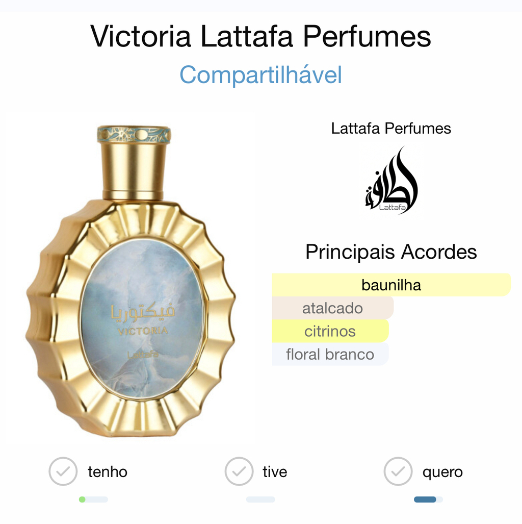 Victoria de Lattafa Perfumes é um perfume Floral Frutado Gourmet Compartilhável. Esta é uma nova fragrância. Victoria foi lançada em 2025. A nota de topo é Lemon Meringue Pie. A nota de coração é Néroli. A nota de fundo é Baunilha.